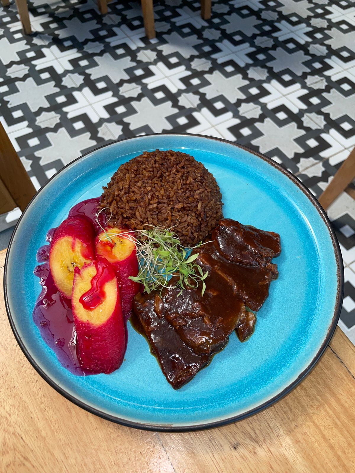 Lomo ancho en cocción lenta con sous vide por 24 horas, en salsa cartagenera con arroz de coco titote y plátano en tentación.